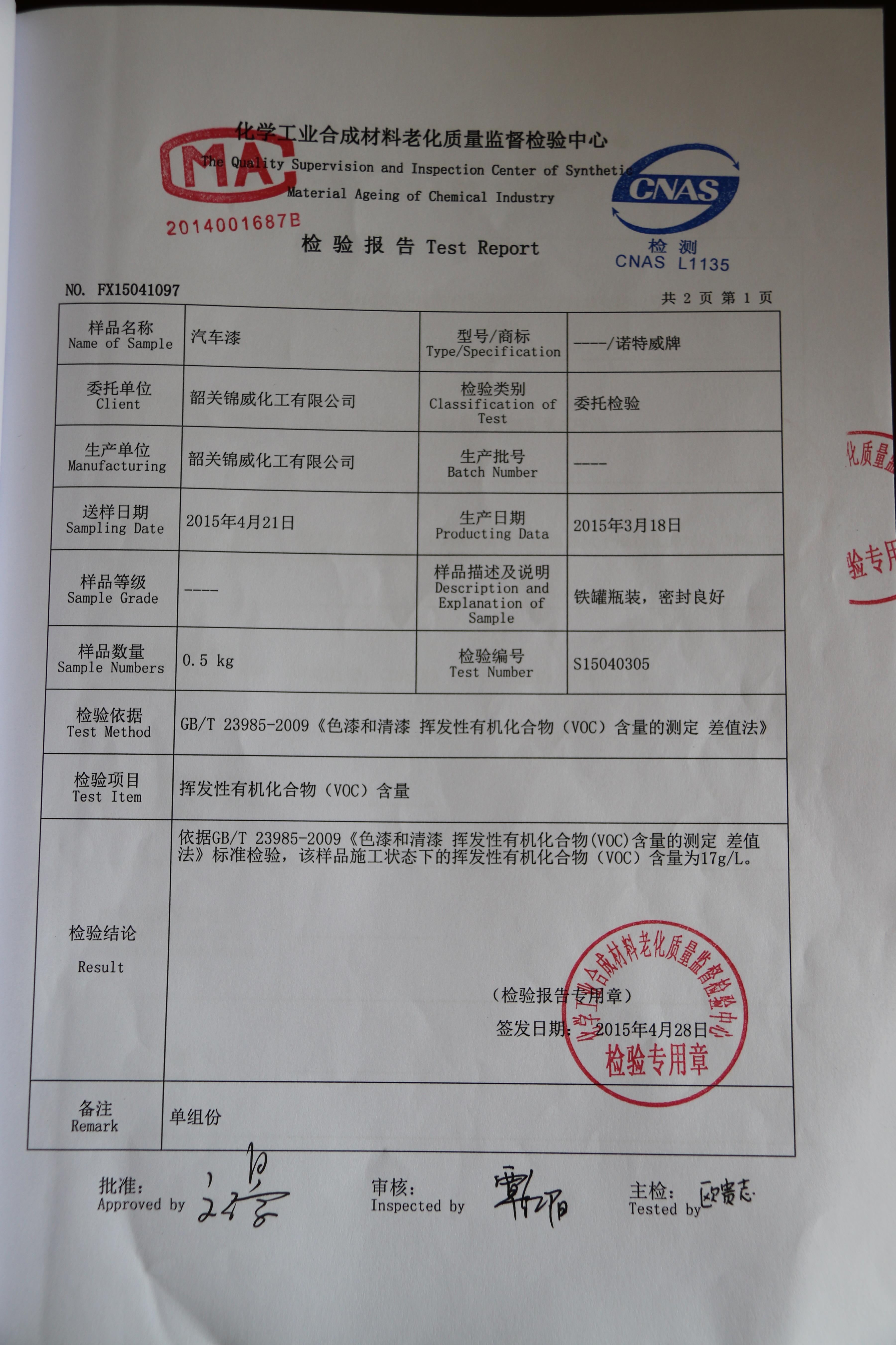 | 廣東省污染物排放許可證 | 諾特威汽車(chē)漆檢驗(yàn)報(bào)告 |